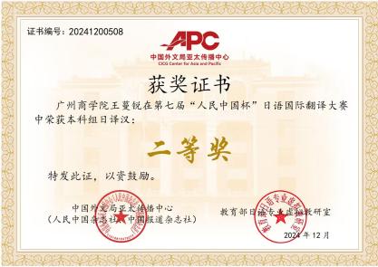 近日,我校学子在第七届“人民中国杯”日语国际翻译大赛喜获佳绩。本次大赛由中国外文局亚太传播中心(人民中国杂志社、中国报道杂志社)与教育部日语专业虚拟教研室联合主办。