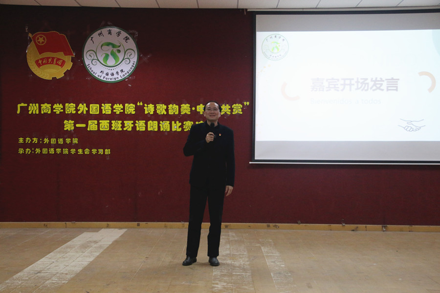 为进一步活跃校园文化气氛,丰富同学们课余文化生活,给同学们搭建展示自已的舞台,提高同学们的学习西班牙语的兴趣,我院于3月16日19:00在一教206举办了“诗歌韵美·中西共赏”第一届西班牙语朗诵比赛。外国语学院党总支书记徐超、西班牙语系负责人吴凡、西班牙语系主任邝美琳,西班牙语系专任教师廖运、何静文、冉梨蕾、22级西班牙语专业辅导员谢敏丽出席本次活动。